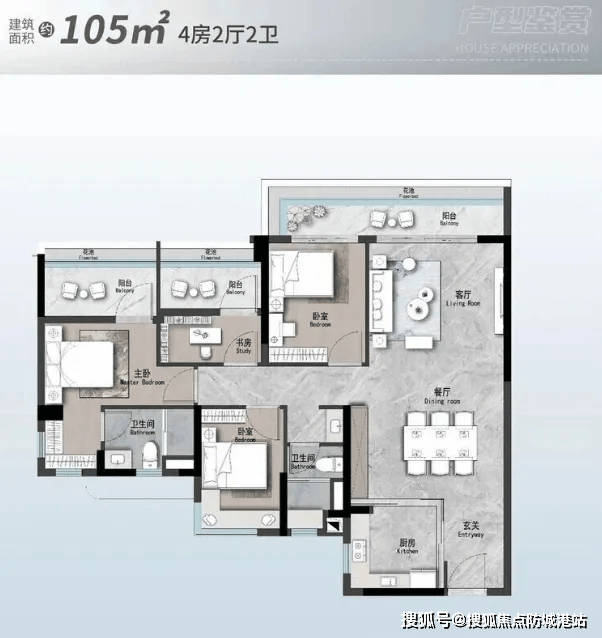 双阳台设计,客厅连通南向大阳台,采光通风俱佳;U型厨房操作流畅;主卧带独立卫浴与飘窗;两间次卧均能轻松摆放1.5米床,适合新婚夫妇或三口之家。