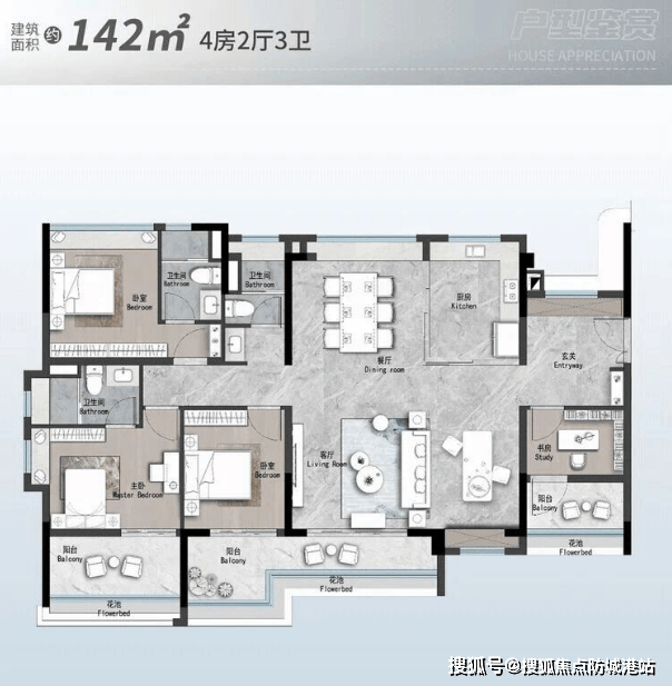 四开间朝南,采光面极佳;6.8米横厅阳台贯通客厅与次卧,视野开阔;双套房设计,主卧配双台盆卫浴+步入式衣帽间,长辈房亦带独立卫浴,私密性满分;中西双厨配置,满足中式爆炒与西式烘焙双重需求。