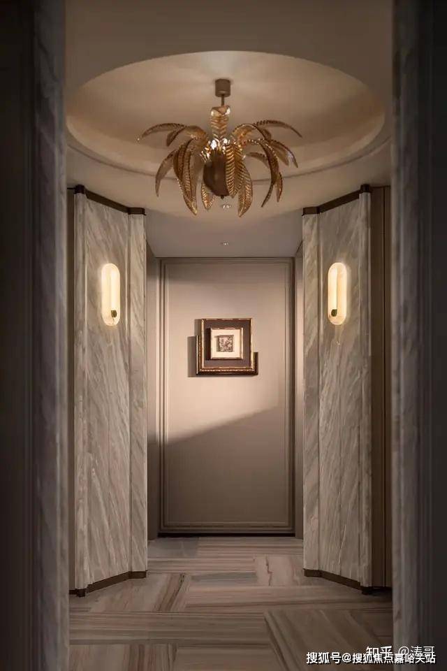 从私享电梯厅开始,经由对开入户门,首先就进入这样一个十字序列厅,视线远处,就是尽头观景台,这条长廊,可以是公私分区的交通枢纽,也可以是彰显主人品味的艺术长廊;