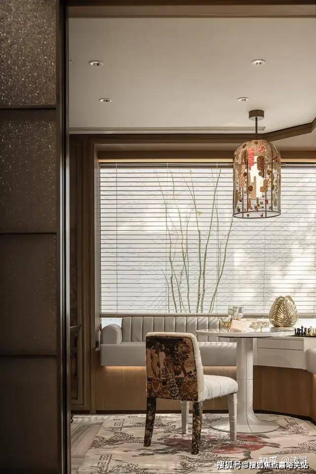 约238㎡户型的客餐厅,位于户型的顶端。自东向南环绕270度的观景台长达约17.2米,在这样的客厅,甚至可以踱步欣赏窗外的满眼梧桐。独立会客厅,可以做小茶室或棋牌,更深一步的隐私感,为专享客群定制。